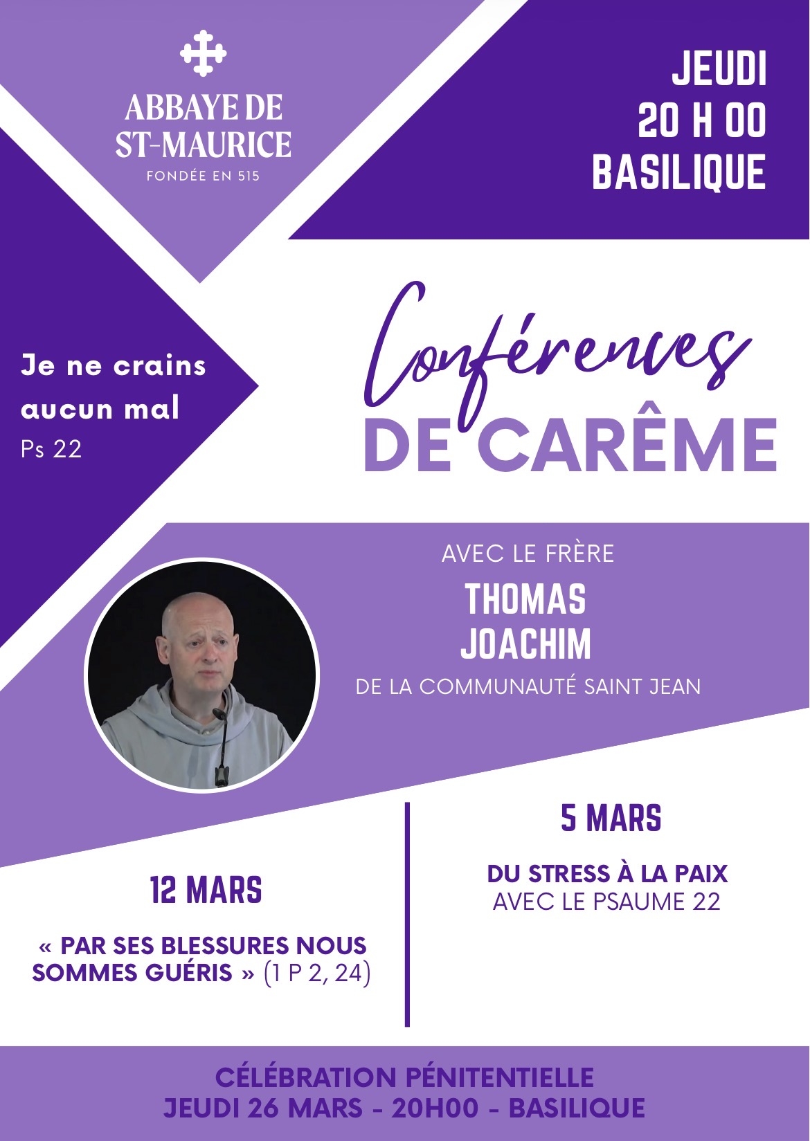 Les conférences auront lieu les jeudis 5 mars et 12 mars dès 20 h 00, à la Basilique de l’Abbaye de Saint-Maurice.